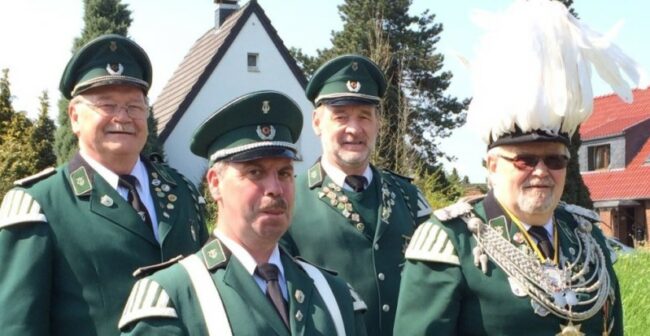 Eine Abordnung des Oppumer Schützentrommlercorps begleitete den neuen Bezirkskönig bei der Krönung und dem anschließenden Festumzug durch die Siedlung an der Untergath. Das Bild zeigt (v.L.) Lothar Olejnitzak, Hans Deutmarg,…